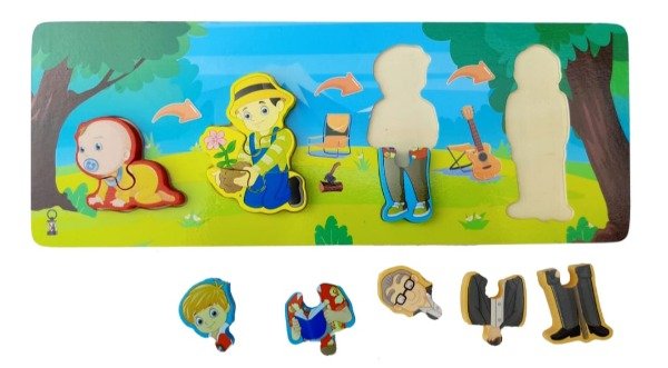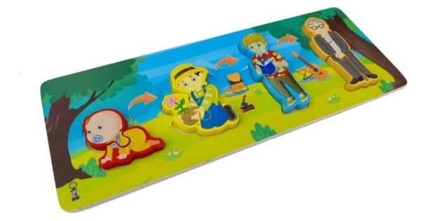 Se trata de un Puzzle Pizarra Interactivo Mini Familia, un juguete didáctico de madera para niños. Este rompecabezas está diseñado para ayudar a los niños a aprender sobre las etapas de la vida, desde bebé hasta adulto mayor, mediante la asociación de imágenes y form