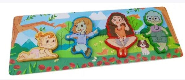 Se trata de un Puzzle Pizarra Interactivo Mini Familia, un juguete didáctico de madera para niños. Este rompecabezas está diseñado para ayudar a los niños a aprender sobre las etapas de la vida, desde bebé hasta adulto mayor, mediante la asociación de imágenes y form